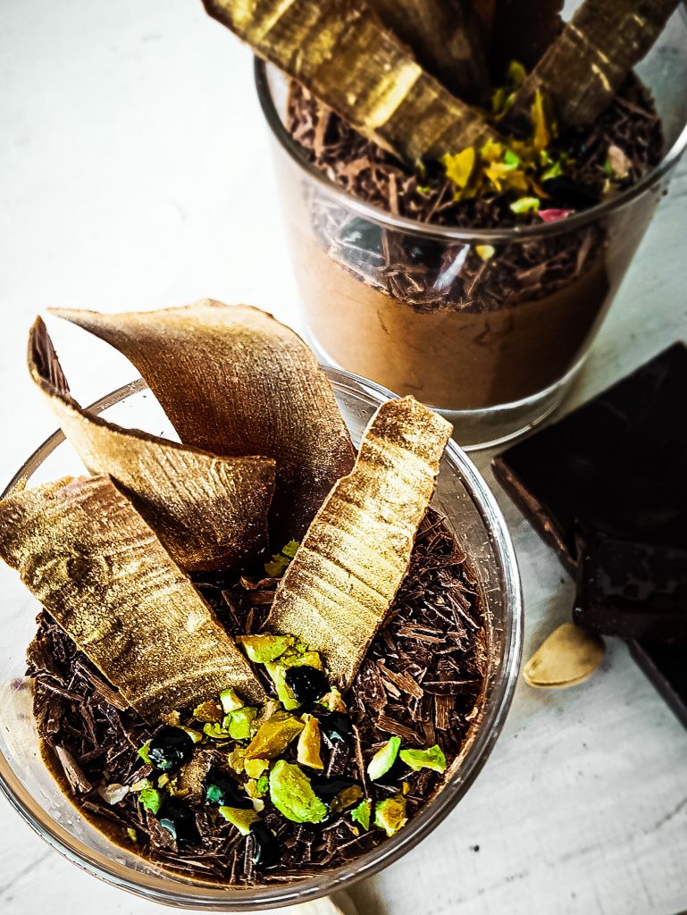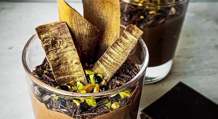 Mousse au chocolat noir et fève tonka végan et sa réduction de crème de pistache